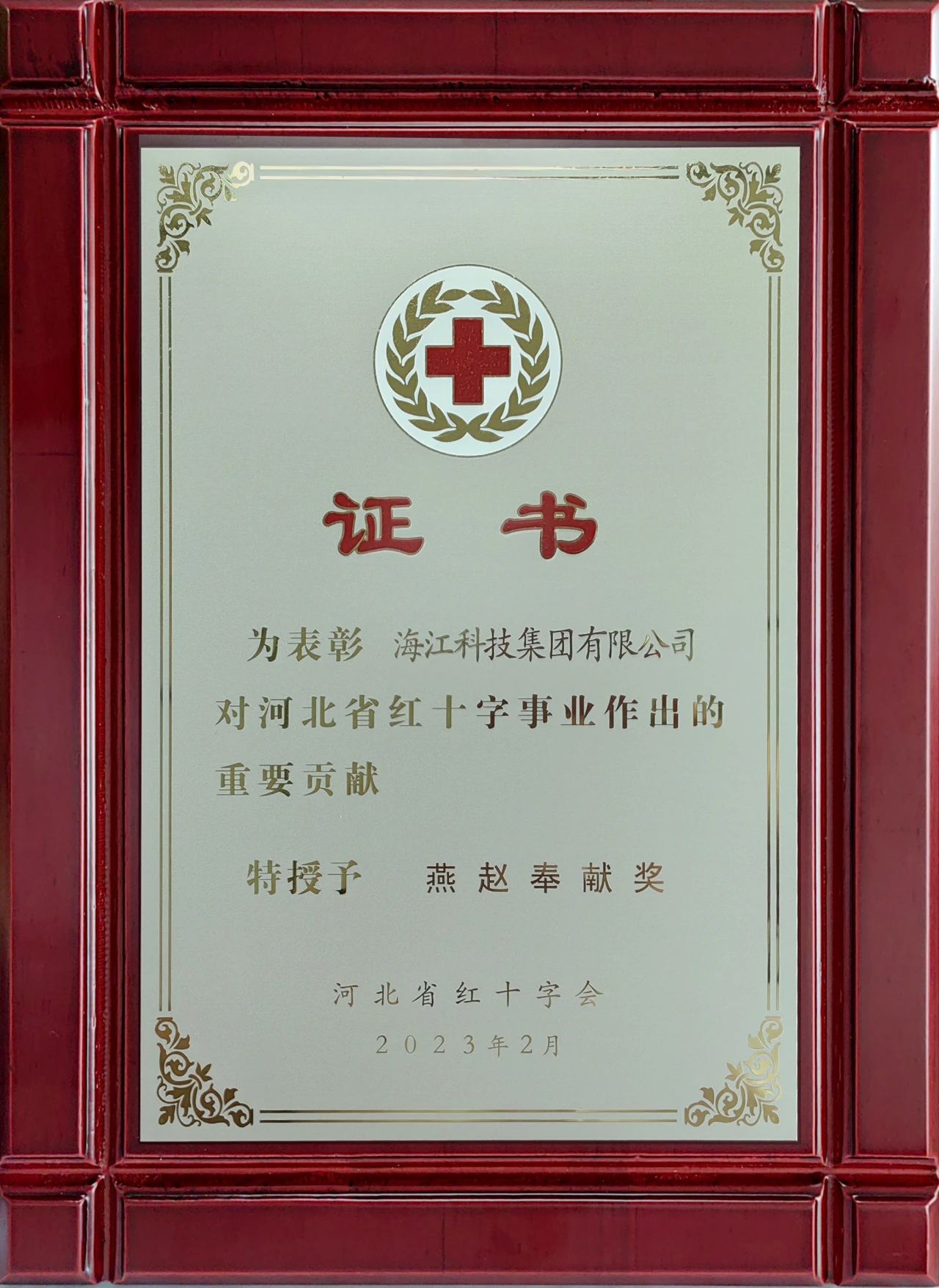? ? ? ?In February, Haijiang Technology Group was awarded the Yanzhao Dedication Award by Hebei Red Cross Society.