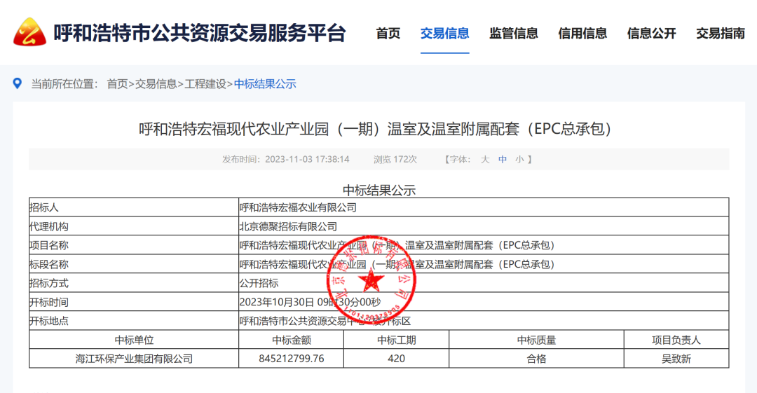 ? ? ? ?On November 4, Haijiang Group won the bid for the phase I project of Hohhot Hongfu Modern Agricultural Industrial Park, which is the world's advanced and national leading agricultural project. The winning bid amount exceeded 800 million yuan, and the total project duration was 420 days.