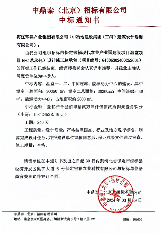 On March 29, Haijiang Environmental Protection Industry Group Co., LTD., a subsidiary of Beijing Haijiang Holding Group, won the EPC general contract for the greenhouse project of Baoding Hongfu Modern Agricultural Industrial Park construction project, which is the third winning bid after the construction projects of Hohhot and Chifeng Hongfu Modern Agricultural Industrial Park. To be a persistent and firm choice of old customers highlights Haijiang Group's excellent reputation, brand reputation and comprehensive strength, and is a full affirmation of Haijiang Group's adherence to integrity, innovation and humanistic values.