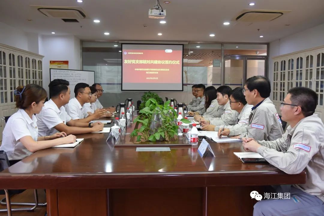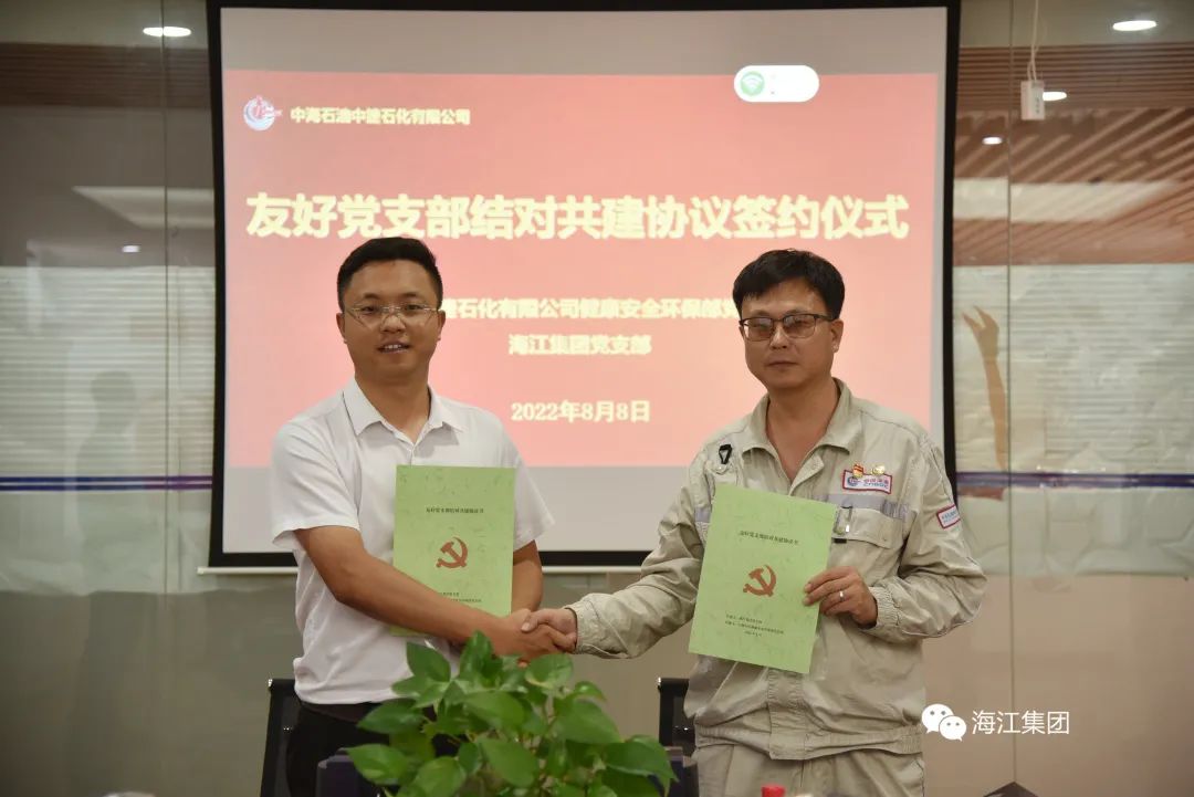 In order to further enhance the vitality of party-building work, and strive to build a new pattern of "sharing resources, complementing each other's advantages, promoting and improving together", on August 8,the Party Branch of Haijiang Group and the Party Branch of HSE Department of Zhongjie Petrochemicals held a signing ceremony of the co-construction agreement.