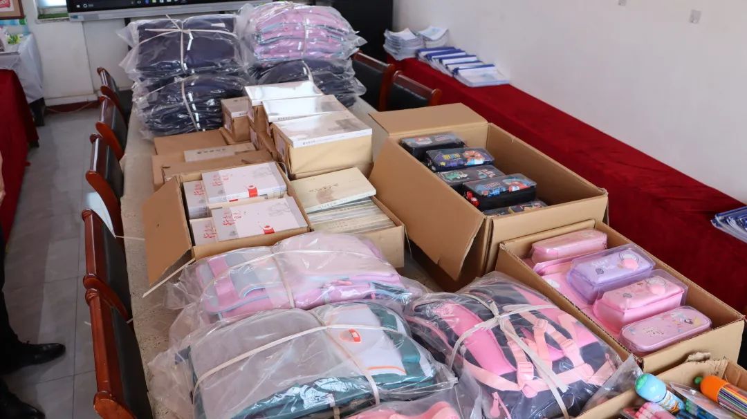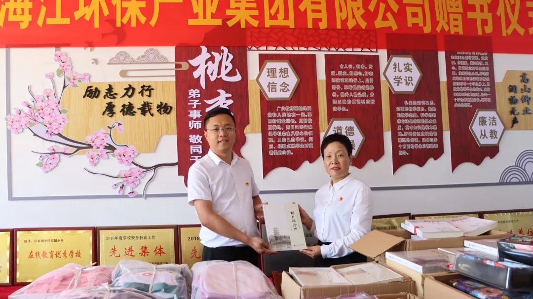? ? 海江集團黨支部書記高琪鎣、企業管理部副經理張博江代表海江集團為滄州學生們送去書包、文具等學習生活用品和《行走的目光》《老家的味道》《明月滿滄州》等1500余冊書籍。