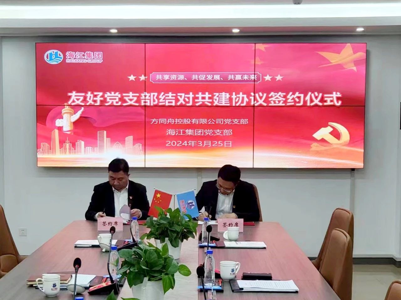 ? ?2024年3月25日,海江集團黨支部與方同舟控股有限公司黨支部舉行結(jié)對共建協(xié)議簽約儀式隆重舉行。方同舟控股行政總裁、亦莊經(jīng)開區(qū)榮華港黨委委員、武安市駐北京流動黨委常務(wù)副書記李雪坡,方同舟控股行政總監(jiān)、專職黨建管理員張帆出席簽約儀式,海江集團常務(wù)副總、黨支部書記高琪鎣熱情接待并陪同考察,雙方就未來黨建共建、共謀發(fā)展等議題進行友好座談。