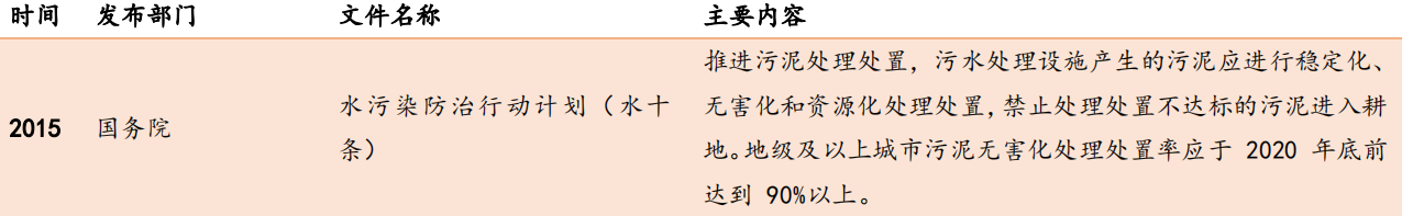 2015年“十三五”規劃出臺,指出大氣、污水、污泥的治理是今后國內環保處理的三個主攻方向?!笆濉币巹澲忻鞔_了污泥處理處置目標、任務與布局,建立完善了污泥穩定化與無害化的相關標準,并闡明了要加強監管與激勵機制,全面地為我國未來五年的污泥處理處置工作做出了重要布局。