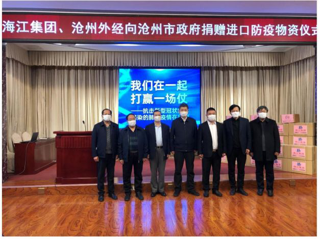 1月31日15:00滄州市市長梅世彤、副市長劉強、秘書長王彤、商務局局長孫壽常、工信局局長王健林、海江集團董事長劉海江、滄州市對外經濟技術合作有限公司董事長尹廣軍等出席捐贈儀式。