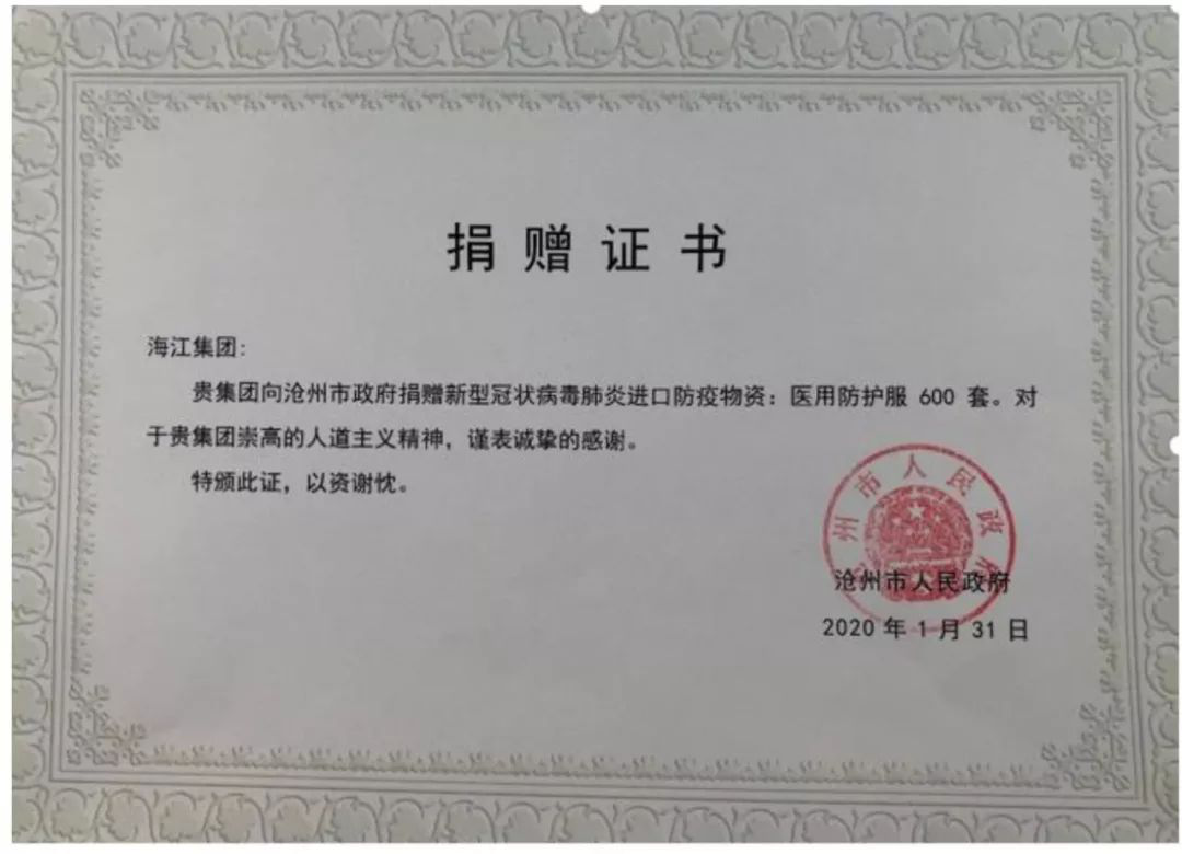 近期,湖北省武漢市等多個地區發生新型冠狀病毒肺炎疫情,牽動著全國人民和海江人的心。在 1 月 25日(農歷大年初一)召開的中央政治局常委會上,習近平總書記再次強調:“生命重于泰山,疫情就是命令,防控就是責任。”在這場突如其來的疫情面前,人人守土有責,海江集團不忘初心使命與社會責任!“心系家鄉,全力支援,抗擊疫情”在國內防疫醫療物資緊缺的情況下, 委托“滄州外經”在國外加急采購一批進口醫療物資,無償捐助滄州市政府,為我市抗擊新型肺炎工作提供堅實屏障。