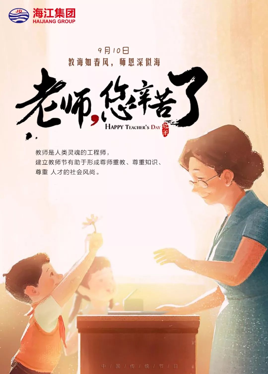 九月是收獲的季節(jié),秋菊溢彩,桃李芬芳。在這收獲成果又播種希望的美好季節(jié),我們迎來了第35個教師節(jié)。在這個美好的節(jié)日,海江集團向兢兢業(yè)業(yè)、無私奉獻在所有崗位的老師致以心底最真摯的感謝和敬意!