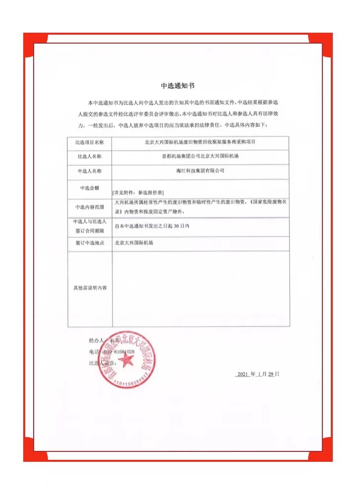 近日,備受關注的北京大興國際機場再生資源循環利用項目招標結果公布,海江集團憑借豐富的行業經驗、過硬的技術力量,以絕對優勢在眾多競爭對手中脫穎而出,成功中標!戮力同心創佳績,喜迎中標開門紅。海江集團不負眾望,以優異成績開啟了2021年奮斗的新征程。