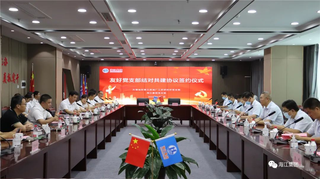 為堅(jiān)持和加強(qiáng)黨的全面領(lǐng)導(dǎo),切實(shí)提高黨的建設(shè)質(zhì)量,實(shí)現(xiàn)“組織建設(shè)互促、黨員干部互動(dòng)、黨建成果互用”,7月8日,海江集團(tuán)黨支部與大港油田第三采油廠工藝研究所黨支部在海江集團(tuán)智能培訓(xùn)室舉行結(jié)對(duì)共建協(xié)議簽約儀式。滄縣人大副主任、高鐵新區(qū)工委書(shū)記郭家文,滄縣縣委組織部副部長(zhǎng)、“兩新”工委書(shū)記李金峰出席簽約儀式。第三采油廠黨委書(shū)記侯立朋、黨委副書(shū)記路明遠(yuǎn)、副廠長(zhǎng)李青,海江集團(tuán)董事會(huì)主席劉海江、黨支部書(shū)記高琪鎣等共同出席簽約儀式。