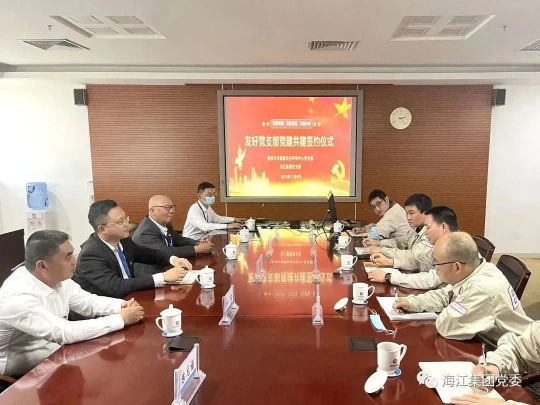 12月8日,海江集團黨支部與惠州石化健康安全環保中心黨支部舉行黨建共建交流活動。中海油惠州石化健康安全環保中心黨支部書記李江山、黨支部紀檢委員劉沖、黨支部青年委員陳梓劍、黨支部宣傳委員呂笛,與海江集團黨支部書記高琪鎣、副總經理葉軍、安環部總監朱衛東等黨員骨干共同出席活動。